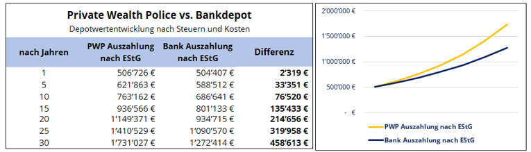 Die Differenz zugunsten der Private Wealth Police wächst mit der Laufzeit.