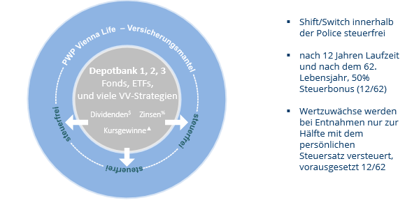 Alle Erträge bleiben vollständig investiert, Zins und Zinseszins wirken ohne laufenden Steuerabfluss. Auch Shift/Switch sind innerhalb der Police steuerfrei.